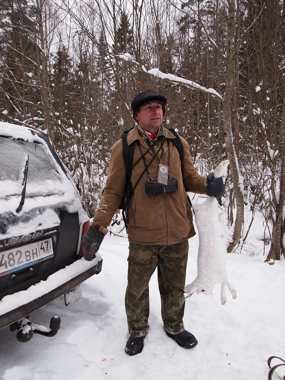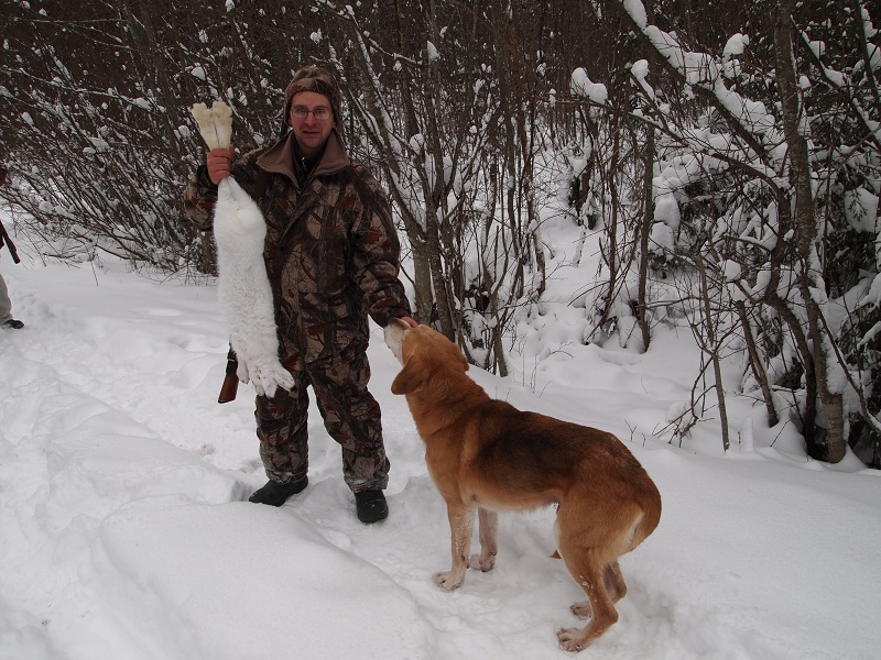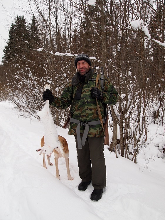 11 января. Отличная пороша. Поехал опять к профессору,с Флейтой. Подняли не сразу,в 12.30. Косой ходил очень широко,в радиусе 3км. Ходил как то безсистемно,дорогу пересекал много раз,но всё в разных местах,мне всё никак не удавалось подстоять. В 15.00 я всё же перевидел,на узкой лесной дорожке,но шёл беляк очень шустро,дорожку одним махом. Стрелял на всидку,метров на 40. Мимо!