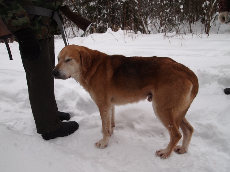 9 января. Опять с Песней. Поехали к Флейтиному профессору,которого гоняли на Рождество. Многоследица,после морозной ночи,следов полно.Недалеко от машины свежий след,прошли по нему метров 300 и подъём.(11.30) С подъёма Песня прогнала с км,скололась,резанула и понеслась назад по гонному следу,до самой лёжки. Я на скол,нашёл длинную двойку и скидку,зову собаку,а она не идёт,копает где то. Звал долго,голос сорвал,трубил...вижу она всё удаляется. Пошёл забирать,благо по прибору всё вижу. Нашёл в буреломе,копает свежую жировку. Отругал,наказал,взял на поводок и по кустам и ветровалам потащил на скидку.