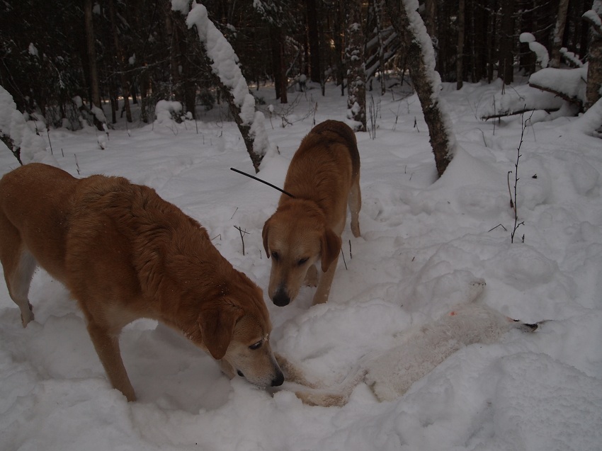 Снег всё сильнее,когда к дому подъезжали,вобще метель настоящая. Зайка,к сожалению,оказался весенней зайчихой,вес 3.5кг. Уши и брови рыжеватые,да подшёрсток не белый,а св.бежевый. Может и тумачок. Жаль,что зайчиха,но я в этом месте редко охочу.