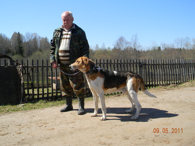 Первая работа. Наброс в 11-57ч. На приездку господа зеленогорцы, легко сказать кладут…, мое мнение, пора за это уже наказывать. Полаз в пределах 100 метров, ходит как валёк или как говорит эксперт Всесоюзной категории Чекулаев Е.К «Ползает как вошь по брюху». Дождик усиливается. «Дон» где пешком, где рысью обследует плотные места в пределах видимости, лес редкий, видно хорош. Смотря на «Дона» кошу глаз на хозяина, а ведь похожи как две капли; спокойный, рассудительный, флегматичный. В 13-00ч. выжлец натек на жировку, куда делась флегматичность? Выжлец заходил как намазанный скипидаром. В 13-05ч. подъем по зрячему, заревел ,запел вот это сила! Гон уверенный, ровный как хорошо отлаженный механизм. Выжлец работает неспешно, где рысью, а где наметом. В 13-27ч. заяц медленно вылезает с густого елового подсада, через две минуты рысью, как паровоз, вываливается «Дон», остановился, презрительно на меня посмотрел, попил водички и дальше погнал. Голос у выжлеца очень сильный двутонный с хорошо выраженным подголоском, но отдает он его как-то без души,редковато. В 1334ч. первый скол, если честно я думал и последний. Косой забрался в болото и основательный выжлец грузный, хорошо упитан шлепал по болоту ломая деревья, настырно тяжело дыша утюжил болото, изредка отдавая голос. В 13-50ч. скол выправил, гон сначала мароватый. В 13-54ч. насел, заяц пошел вдоль асфальта, где еще раз был перевиден экспертами, выжлец за ним в двух минутах. В 14-05ч. дана труба, выжлец еще два часа работает, а хозяин мило улыбается. Выжлец отработал на гону час, на выправление одного скола затратил 16 минут, гон уверенный . Расценка: 5-3-18-9-15-9-3-4-7-2=75б. ДИПЛОМ II ст.