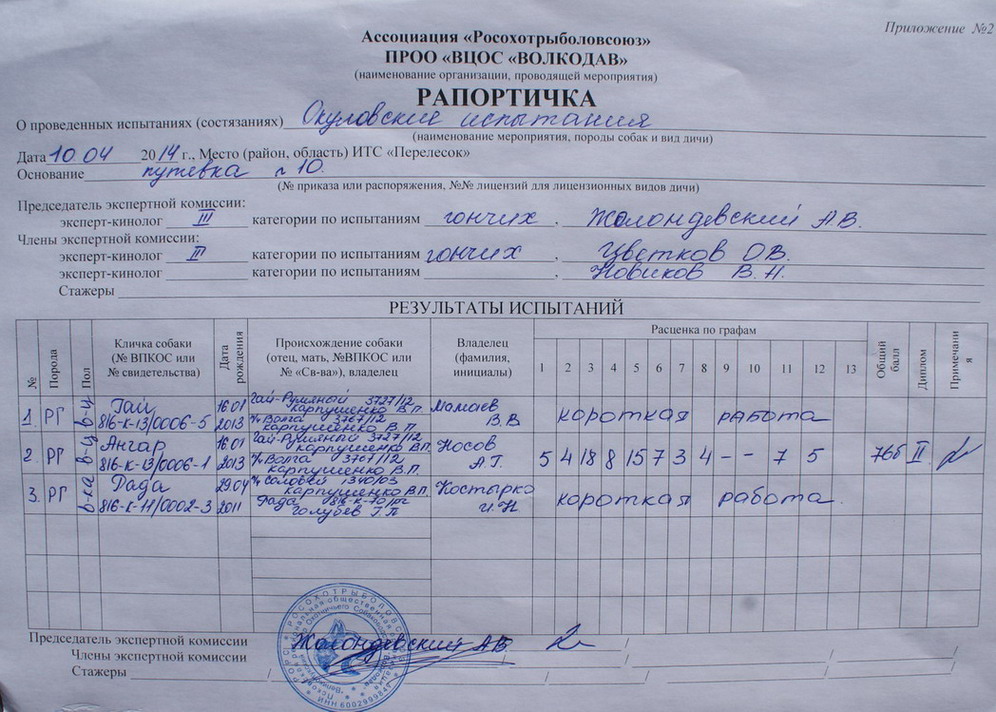 Поле,1- 1ст,2-3ст.Участвовало 3 собаки.