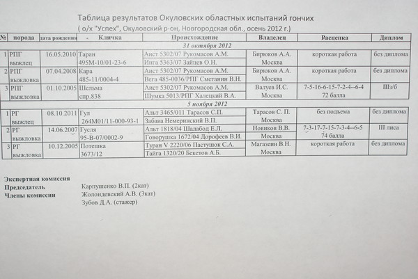 Результаты весенне-летних испытаний гончих собак в Окуловском р-не.