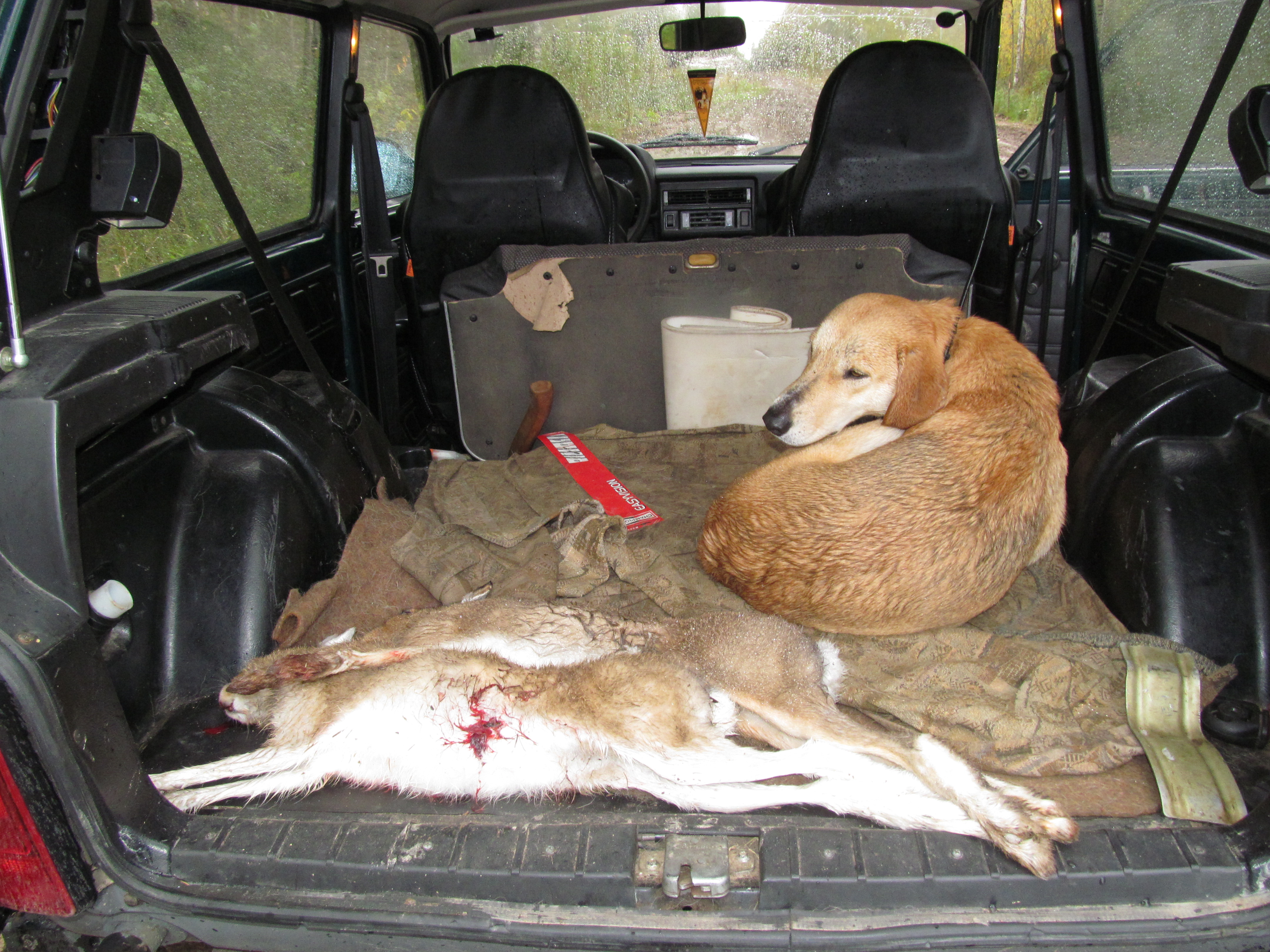 Спасибо, конечно я очень довольна. Будишка,правда, через раз с голосом ходит. В воскресенье не отдала голос. Но это другая тема. Случай подвернулся золотой, для нагонки молодой, да не вышло. Заезжала с обеими гончими в угодья, еще не сильно рассвело. Навстречу беляк по дороге "шкарапетил" на лежку. Разошлись левыми бортами. При мне свернул с дороги и спокойненько отправился за холм спать. Я отьехала метров 100. Решила старшую не выпускать, молодую на след поставить. но не тут-то было. Забава такой концерт закатила! Будишка притихла и все к машине тянулась. Пришлось старшую выпустить. Зайца то погоняли, пока его ливнем не смыло. Только Будишка молчком ходила и часто ко мне возвращалась. Ладно. зайца мы пометили, мелкий, молодой. В другой раз будет кого погонять.