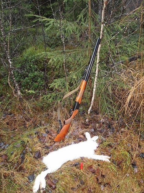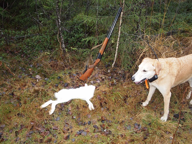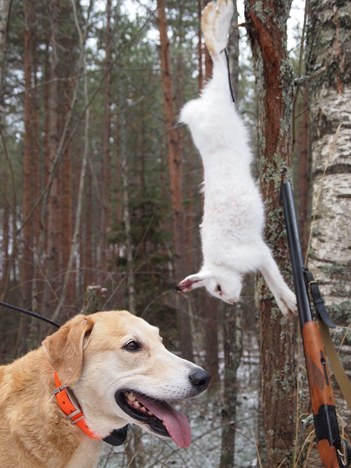 9 ноября. Тосненский р-н. Подняли быстро,минут через 40. С утра опять мороз,но днём маленько отпустило. На первом кругу я дуплетил,не далеко,метров 20,но через ёлки,в угон,мимо. Заяц небольшой,но чисто белый. Ходил не широко,но постоянно западал(может и зацепил),через пару часов такого гона,косой по прямой в песчаный карьер и там скол. В этот раз,на песке собака плохо чуяла,хотя в этом же карьере в октябре отлично гоняла и тогда взяли.