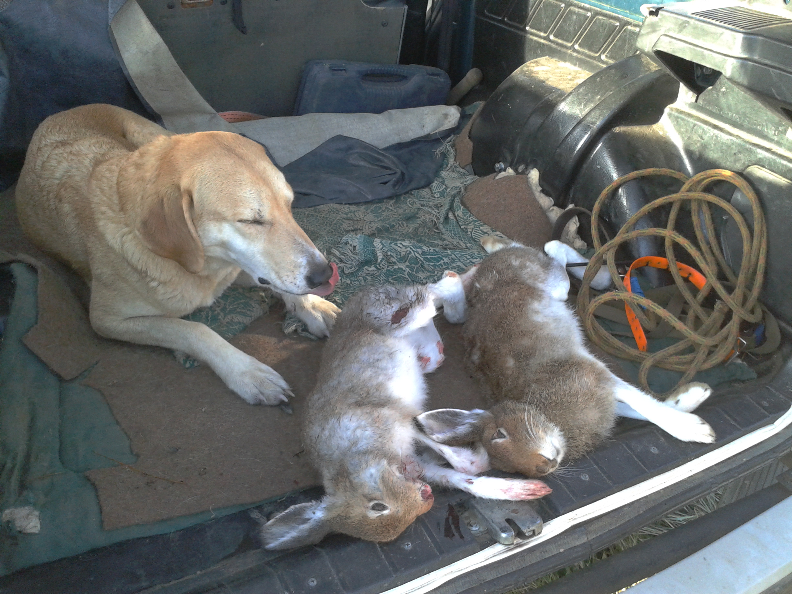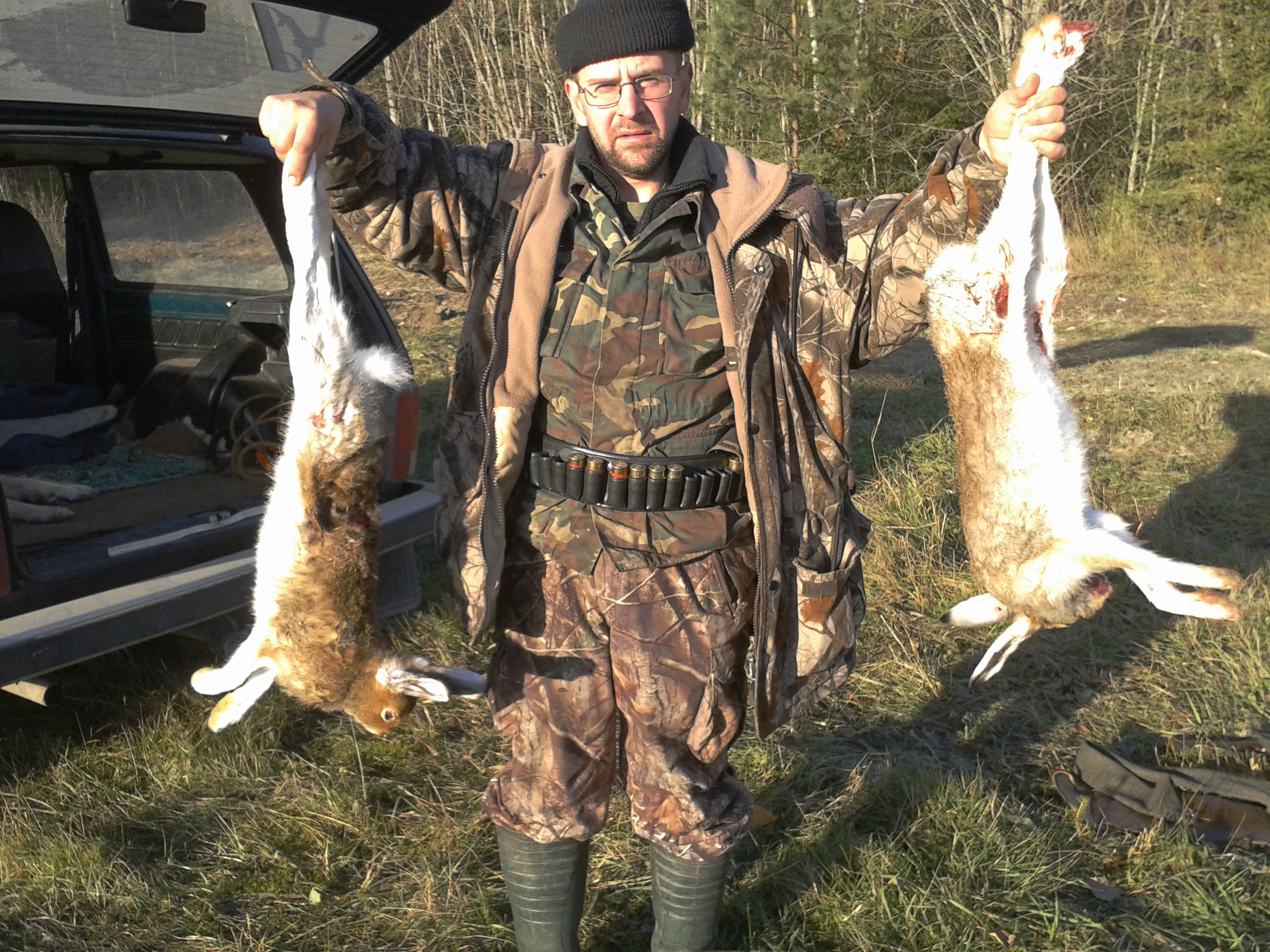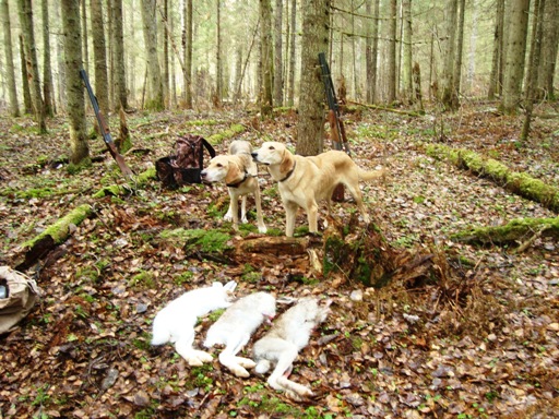 А это день второй. У нас уже три собаки, совсем весело. Взяли только этого зайца, хотя гоняли трех. Второго я постригла и он ушел куда-то в завал и похоже там дошел. Собаки расковырять не могли. Очень печально. Третий, размером с Будишку топотал вокруг нас, все его видели, но вне выстрела, решили оставить на следуюший день, но так сложилось, что с охотой пришлось закончить. Мы уехали домой.