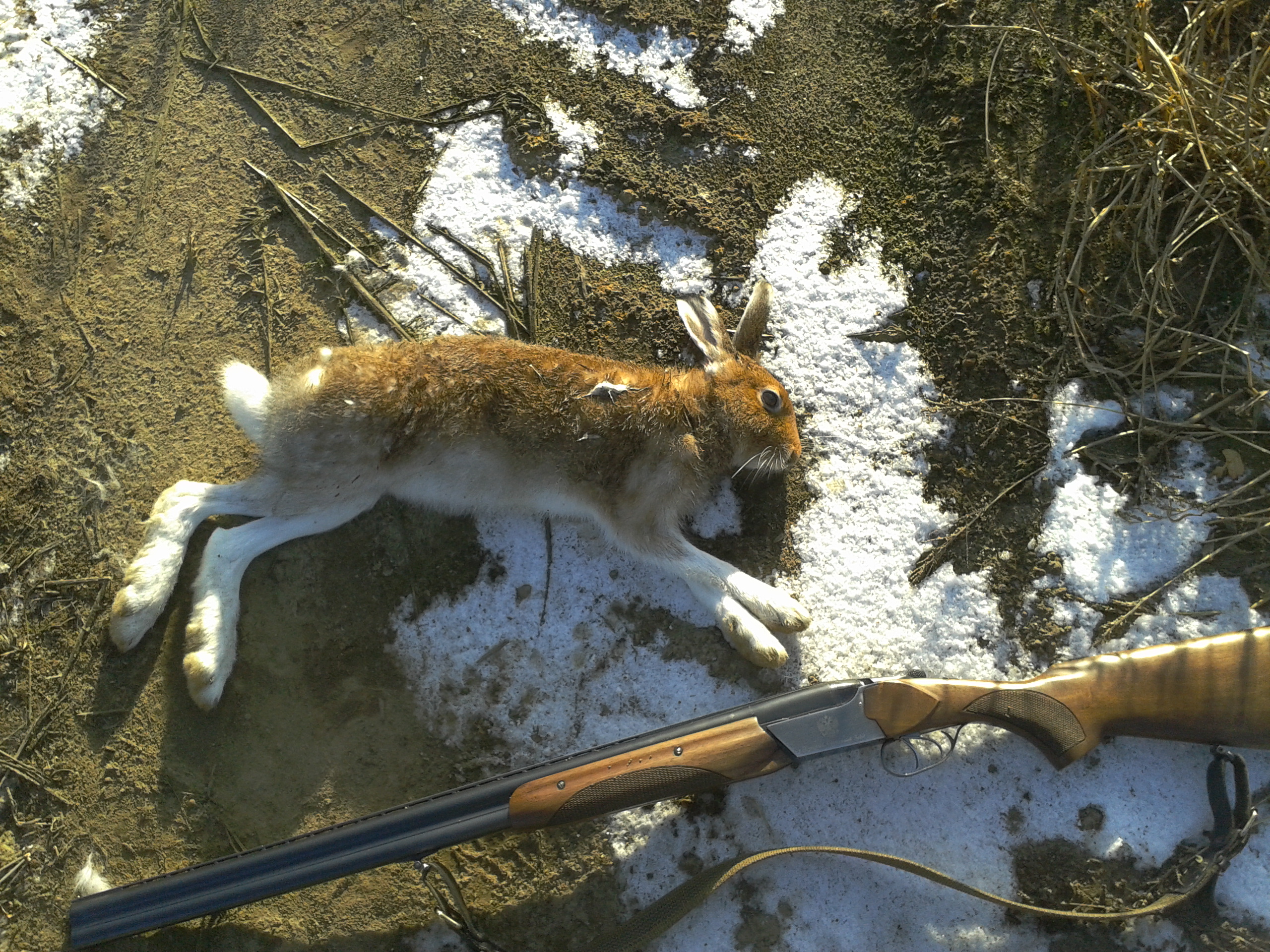 Все зайцы разные. Самый маленький первый, почти не перелинял, подранок. Взят собаками в растяжку-голова-задница у меня на глазах в 10 метрах. Для молодой, Будишки, это был просто праздник какой-то! У неё даже базедова болезнь с глазами приключилась! Вытаращилась и все пыталась у зайца что-нибудь оттяпать.