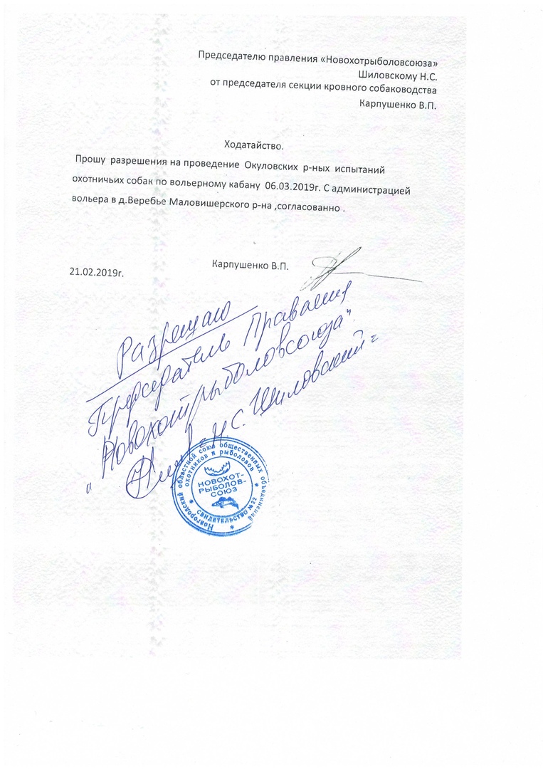 06.03.2019г. Запланировано проведение Окуловских испытаний охотничьих собак по вольерному кабану.Испытания будут проходить в д.Веребье , Маловишерского р-на. Стоимость участия 1000 р. Телефон для приема заявок на участие в испытаниях 88165725503.89116214507 89212079029.Сбор участников и жеребьевка в 10ч.00мин д.Веребье .Маловишерского р-на.