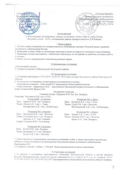 03.05 - 05.05 Состоятся открытые Новгородские областные состязания гончих по зайцу-беляку «Весенние голоса 2019»,посвященные памяти эксперта-кинолога Бойцова Л.Н. Место проведения Новгородская обл. Окуловский р-он.
