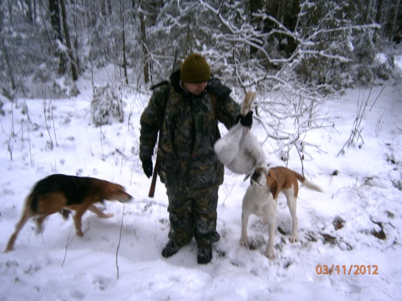 Сегодня с утра приехав из первопрестольной, сразу рванул в угодья. Взял старшую выжловку (её очередь). В лесу пересеклись со знакомыми из Сокола, так что послушали гон двух собак: выжлеца РГ и выжловки РПГ. Заяц ходил большими, но правильными кругами. на первом кругу был перевиден, на втором обстрелян, на исходе второго руга добывт. Собаки, хотя и гоняли вместе первый раз, на гону не грызлись, периодически сменяли друг друга (в плане ведомая - пристяжной и наоборот). Заяц попался мастеровитый, напетляет в подсаде, скинет, метров 20-30 по прямой и опять мастерит. От собак шёл недалеко.