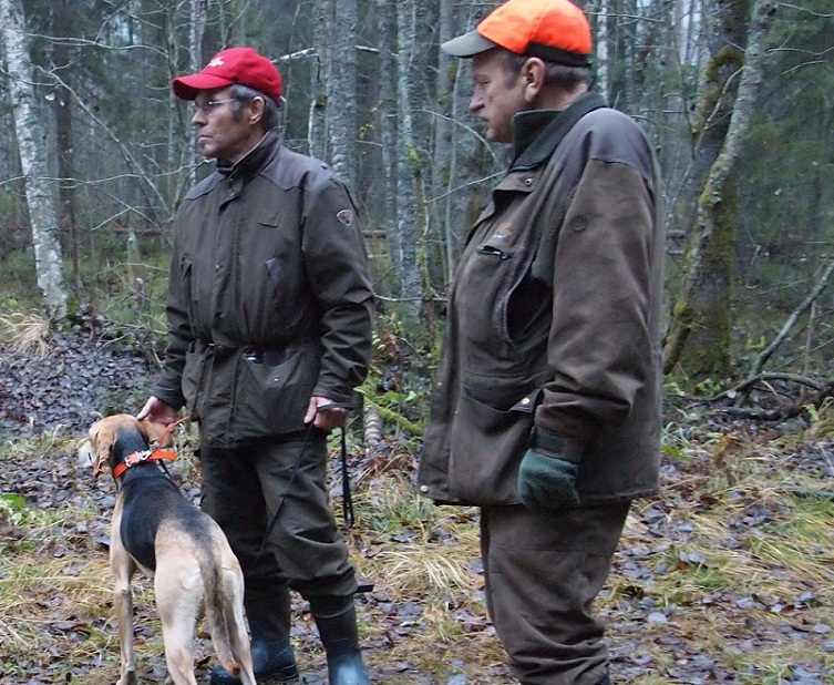 Первым прошёл Пиф, немного отдал голоса, но зверя не побудил. Да и были небольшие сложности с его снятием. Вторым пошёл Теему с Риной. Надо отметить, что Рина выжловка яркого экстерьера и очень молода. Ходила очень широко. Вообще у Финских охотников принято стоять на месте не мешая гончей искать зверя. На наши расспросы они только отвечали: "собака лучше знает где искать зверя, ей не надо мешать".