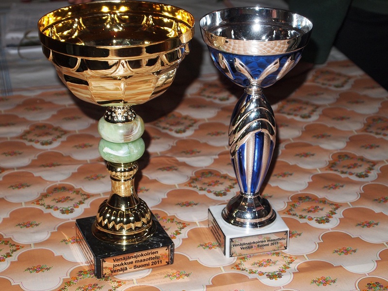 Участвовало 10 РГ,по 5 собак от каждой стороны. Всего получен один диплом 1ст по з/б Финским выжлецом. Команда гостей получила Кубок за победу в этом матче. Все участники и эксперты,получили памятные призы и подарки от организаторов.