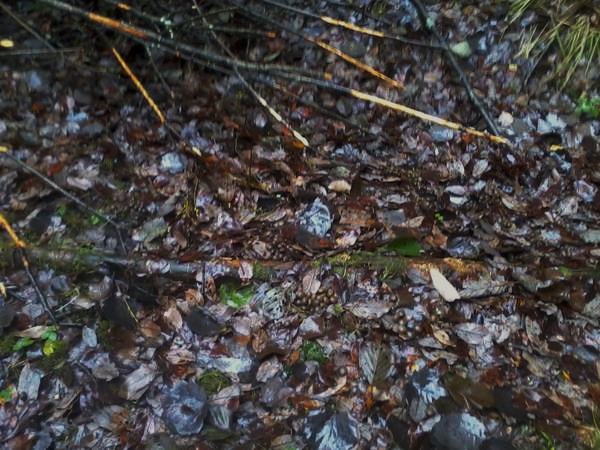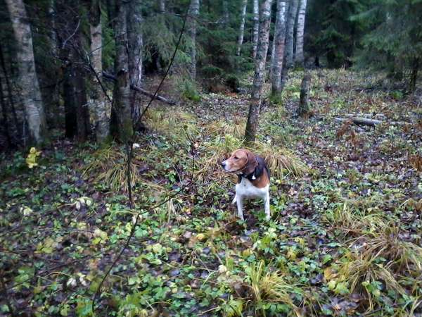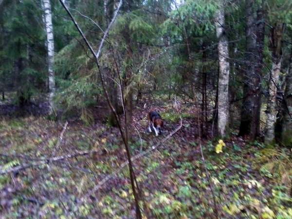 С 12-ти начался сильный дождь, но мы идем, вот жировка, осинка, какашки, собака уже прихватила. Через какок-то время подъем на вырубке. От меня далеко плохо слышно, дождь ветер, отгонял скололся, снова гон. Смотрю по прибору заяц ушел через речку в густой ельник.