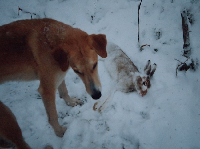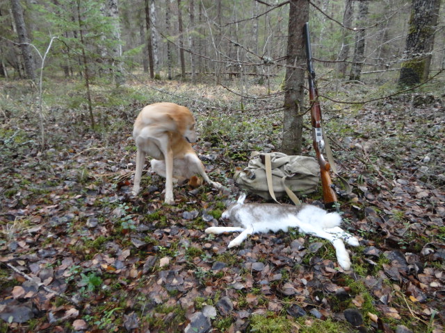 Выход третий, через день. Погода сухая, легкий морозец, полный штиль. Через 20мин. находим. Пытаемся поднять. Шаримся вокруг жировки кругами. Прошел час, пусто. Понимаю, раз сдесь нет залег дальше. Соображаю где и перемещаюсь туда. Собака заходила кругами, гон крутиться, кажется сечас отвалится. Иду за ней. В стороне замечаю две сухие ёлки, лежащие рядом, поваленные ветром. Подхожу в плотную, смотрю, ничего интересного. Подумав, решаю идти к собаке, делаю шаг. Справа, из под елок,с шумом вылетает косой и на утек. Срываю с плеча ружье, заяц весь белый, как снег, беру на мушку, до него метров 20-25. Не стреляю. Кричу во весь голос : Астра! Вот!!! Вот!!! Собака со всех ног рвет ко мне, натекает на след и дело пошло. Лес загудел. Собаку слышно отлично. Гон поворачивает в мою сторону, все ближе и ближе, до собаки метров 250. Заяц должен быть уже близко. Вдруг вижу метрах в 70 мелькнуло белое.Мысль, чёрт идет мимо меня и скрылся в пятачке подлеска из низких, но густо растущих елечек. И вдруг из подлеска, прямо на меня, летит белый, белый ком. Сначала немного оторопел, до зайца метров 5. Поднимаю ружье и кричу: Куда преш! (Это что бы не стрелять в угон, развернувшись на 180, не удобно). Заяц резко берет вправо. Отпускаю подальше стреляю. 14 ноября последний свободный день. На кануне вечером собираюсь в лес. На утро досада, немного проспал. Решаю не ходить. Часов в 10 свербит, нет пойду, хотя бы просто поболтаюсь по лесу. Сажусь в машину, в 10.30. на месте. Выпускаю собаку, сам собираю ружье, потихоньку выдвигаюсь в лес. Собаки нигде не вижу. Медленно продвигаюсь в перед. Смотрю по навигатору, до машины 500м. Прошло 30мин. собаки нет. Про себя ругаюсь, блин очень самостоятельная стала. Пошел мелкий, мокрый снежек. Решаю идти дальше, найдет. Пройдя метров 150, далеко сзади слышу лай. Побудила! На втором круге слышу гон накатывает на меня. Нет уходит влево и вдруг,под девяносто градусов, разворот в мою сторону. Снимаю с плеча ружье, жду. Вижу мелькает косой, идет быстро, выжловка наседает, молодая, горячая гонит шустро. Заяц идет немного стороной, поднимаю ружье, решаю выстрелить. Может зараню, пусть догонит. Выстрел. Вижу перевернулся через голову, забился на месте.Пока подошел, Астра уже пересчитывала его позвонки. Увидев меня отпустила. Стала ждать то, что заслужила. Были ещё 3 дня. С подьемами и гоном. Но хвастать нечем. В общем и целом я доволен. Собачька пошла, будем нарабатывать мастерство.