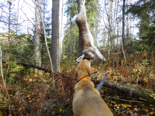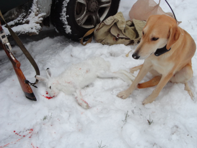 В теме "Зайцы Вологодчины" от 30 ноября, я писал, что заранил косого,( метров с 70) пошёл с кровью. Погода дрянь, дождь, талый снег. Запал наглухо. Егорыч окрестил его "меченый". Сегодня решил его проведать. Всю ночь шёл мелкий снег, да и когда приехал на место тоже. Про себя думаю в пустую. Да и жена ещё дома - не езди, бесполезно. Вчера был, гоняли . Смотри собака устала, с вечера как легла даже не вставала. Всё равно гонять не будет. А что дома, телик смотреть, да диван на спине целый день носить. Поехал. Астра (не это не навигатор, такое имя), когда стал собираться, с не охотой но встала, лениво села в машину и улеглась. Когда въехал в лес, смотрю забеспокоилась, встала, заперебирала лапами. Прибыли на место. Выпустил из машины, чтобы справила нужду. Достаю астру (теперь уже навигатор), ошейник долго не ловит спутники, (густая облачность), Ну вот, все "Garmin" в порядке, надеваю на собаку. Идём к тому месту, где обитает "меченый". Собака рядом и все время пытается свалить. Окриками останавливаю. Вроде пришли,(путь занял минут 15), даю команду, собака рванула в полаз. Смотрю по навигатору,в право, 100 м. Крутнулась, но пошла дальше. Медленно продвигаюсь параллельно. Мысль, что свежий снег шёл ночью не дает покоя, заяц ходил мало, а может, вовсе не ходил. Выжловка молодая, в ноябре только начала работать и то так... . Мастерства нет, не найдёт. Опытной собаке и то сложно. Прошёл метров 200, до собаки примерно столько же. Смотрю ходит кругами. Остановился жду. Вдруг отдает голос, побудила! Гон пошёл, слышно плохо, снег на деревьях. Смотрю по навигатору, круг, пошёл второй и все в радиусе 150м. Иду под собаку. Прихожу. Колотить меня горбатить. Такой бурелом, елки, осины навалены, прошлым годом, вкось и вкривь. Вижу следы - заячьи. Забрался на поваленную ёлку, думаю, раз ты ходишь по бурелому, буду ждать здесь. Только угнездился, смотрю, Астра выдавила косого из бурелома и гон пошёл по прямой. Стал выбираться обратно, наеб...ся пару раз, про себя "обласкал косого. Вот я на чистом. Гон по прежнему уходит по прямой, собаку давно не слышно. По навигатору, до собаки 1,54 км. Дальше скол. Путает, крутит косопузый. Смотрю, собака пошла обратно . Бегу на угонный след. Раз не пошёл на круг, вернётся своим следом. Прибежал, думал легкие выплюну. Встал на след , в середине распадка слева, справа горы. До собаки 700, вот уже 400м. еле слышу. Вроде косой должен быть рядом. Беру ружьё в руки. Минуты ожидания - нет. Дыхание успокоилось. По навигатору Астра пошла обратно. В башке мысль - может подшумел, к лежке не пойдет, или другой тропой. Беру гармин, смотрю, собака крутится, опять скол. И вдруг краем глаза замечаю какое то движение. Поднимаю голову. Катит родимый, метров 25 правее. Ну, теперь ты мой!!!