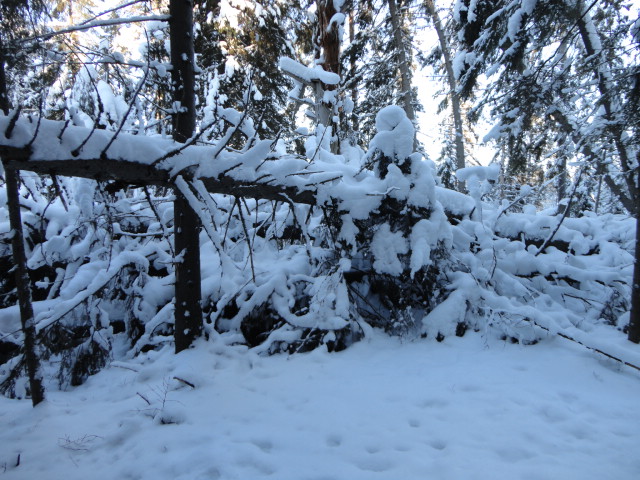 10-го февраля бвл в лесу. Мороз за - 20. В 11.00. подьём, 350м. слева от меня. С подьёма, косой пошёл по малому кругу. Я попёр напрямую к лёжке. Не тут то было. Бурелом, чапыжник.