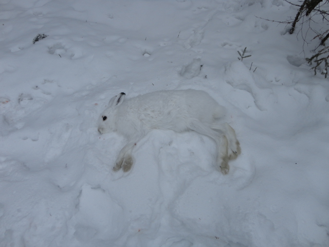 7-го, суббота. В лесу выпал свежий снежок. До обеда, глухо как в танке. Ни подъёма, ни даже следочка, хоть старого. Около часа дня,собачки побудили. Придя на место подъёма, увидел засыпанные следы. Всё как обычно, не мне вам рассказывать, встал, покормился у лёжки и снова спать. Зая прибылой, уходил от лёжки не далее 600 м. , но ходил крепями, очень густым ельником и молодым, тонким березняком, как частокол, человеку трудно пройти, но то слева, то справа от лесной дороги. Первый раз проскочил через дорогу метрах в семи, как пуля, ружьё не успел вскинуть. Сделав круг, вышел опять на дорогу (потом пощитал 73 шага) и встал столбиком, слушал собак, приложился, выстрелил. По фонтанчикам на снегу от дроби вижу накрыло, он срывается и от меня, луплю со второго ствола и опять вижу накрыло, не фига удрал в лес. Сделал круг, проскочил через дорогу, не перевидел. Дед, Афанасий Егорович, подтянулся ближе ко мне. Минут через тридцать опять проскочил через дорогу, метрах в 15-ти, ударил навскидку, дуплетом. Первым ничего, вторым через небольшую ёлочку. Пропуделял ! Больше из чапыжника не выходил. Стал часто западать, 10 минут гон, да ну, разве это гон, а перемолчки аж до 30 минут. Встал в чащу, видел его ещё один раз, промелькнул, шёл тяжело, уже не так шустро как до второго дуплета, наверное зацепил. Собачки продолжали его толкать, 17:30 , стемнело, пришлось снимать с гона. Афанасий Егорович сказал: