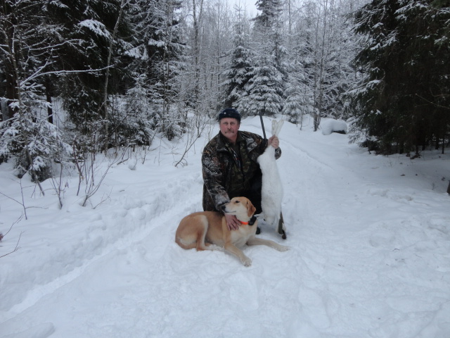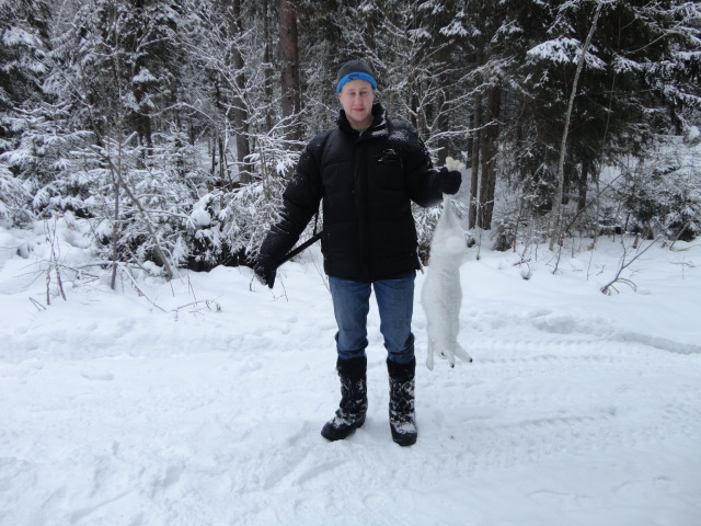 Приехали в лес в 8.30. Собрали ружья, сразу у машины набросили собак. Через 15 мин. подъём. Зайку подняли в густом чапыжнике. По нему он кружил минут сорок. Гон не понятный, какой то очень мороватый, с большими перемолчиками. Потом собаки выдавили его от туда и вот тогда пошёл настоящий гон. Да и не гон, а песня, заслушаешься. Но дело не в этом. Юра стрелял по нему четыре раза, а он "тварь" ушастая оставался невредимый. Переходил газопровод 4 раза в одном месте, где стоял Юра, с разницей 20-40 метров. Добавлю вот что. У Юры охот. стаж больше 30 лет. Занимались с ним промыслом, (при совдепии) куница, соболь и т.д. Только на его счету 7 медведей, лосей больше десятка, так что стрелять умеет. Но из четырёх выстрелов даже не зацепил. Ну точно, этот косой - заячий колдун. В общем к 14.00 собак с хвоста сбросил.