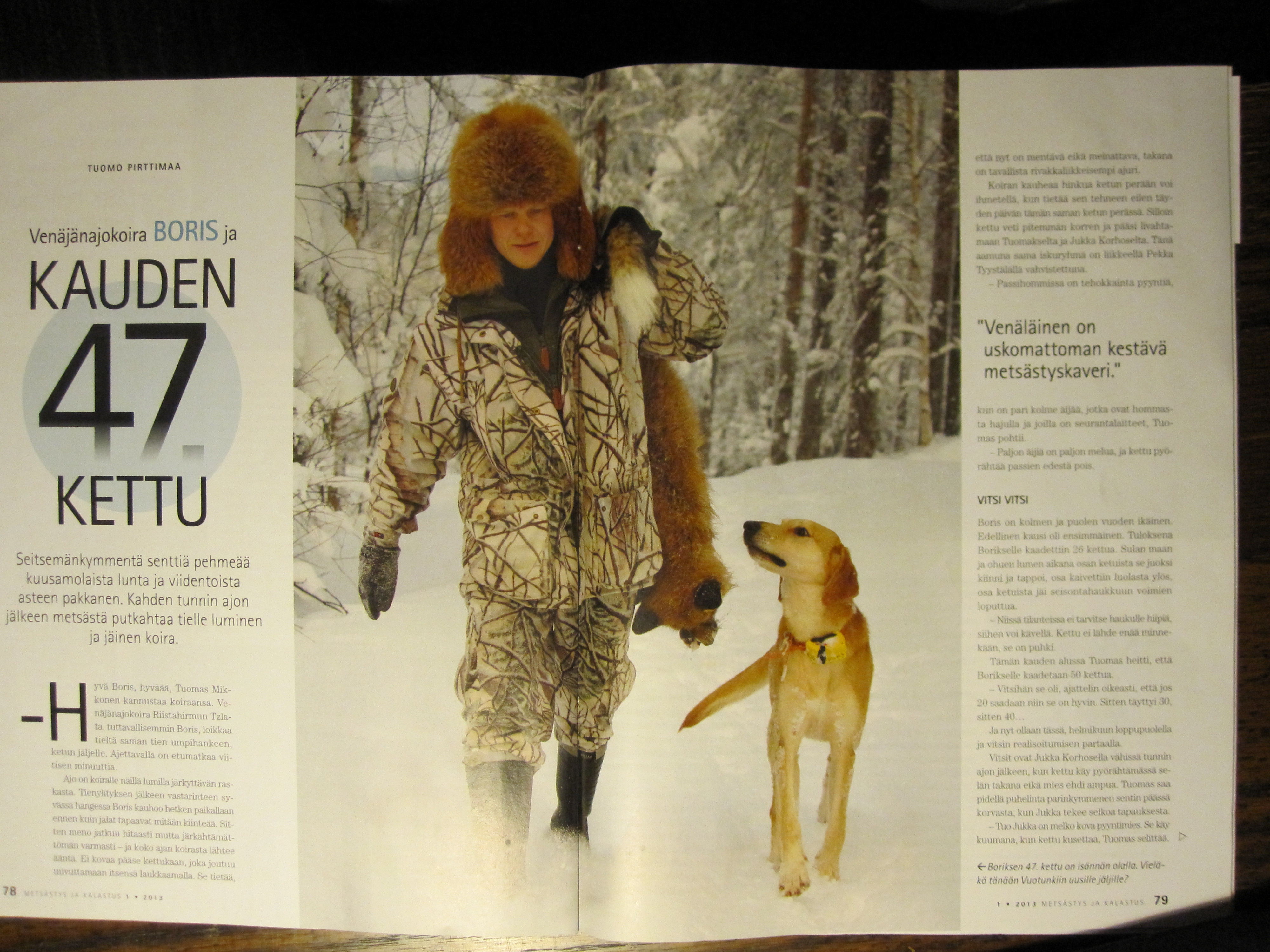 В сезон 2012-2013 поймали 54 лисы, 1 лесную собаку и 1 рысь. Борис гонял тоже волка и медведя.Ярослав писал(а):Этой зимой в одном из охотничьих журналов в Финляндии вышла статья.