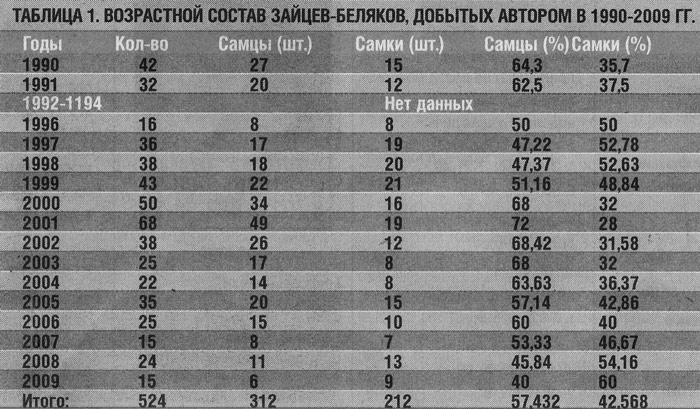 Большое значение для изучения динамики численности любого вида имеют сведения по половому и возрастному составу популяции. Хотя литературные данные по этому вопросу минимальны, у многих исследователей сложилось мнение, что соотношение полов в популяциях зайцев соответствует соотношению 1:1.