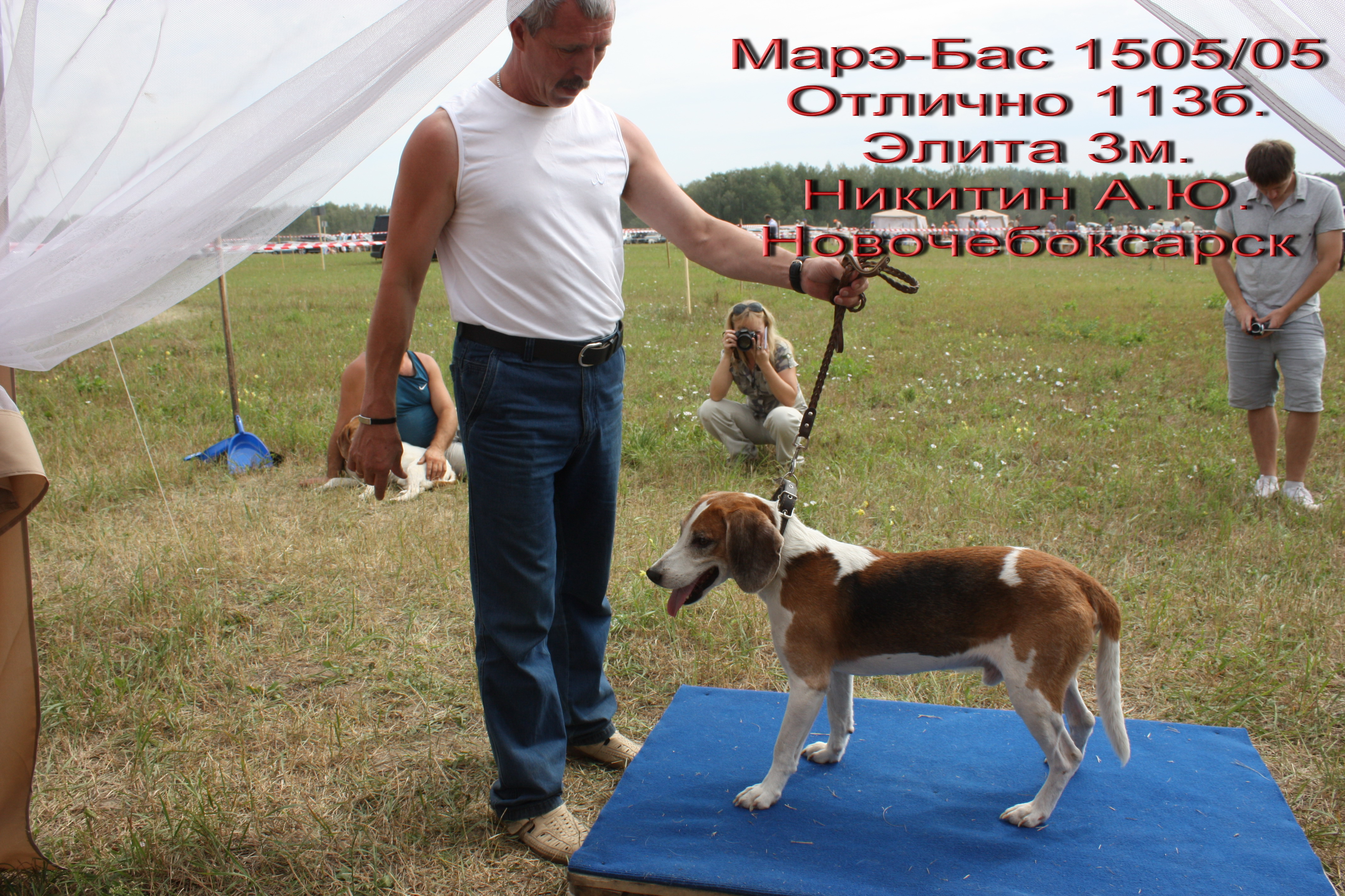 Породный, крепкого, легковатого костяка, чепрачного в румянах окраса. Рост в холке 47 см., индекс растянутости 108. Голова породная, для выжлеца легковата. Глаза темные, ухо длинное, правильно посажено. Морда коротковата, прямая, параллельна линии черепной коробки. Холка слабо выделяется, спина крепкая, прямая,поясница развита, круп немного скошен. Грудь развита, в овале, спущена до локотков, живот умеренно подобран. Конечности крепкие, в правильных углах сочленений. Гон правильной формы. Прикус в стандарте. Крипторхизм отсутствует. Очень хорошо. В ринге одиннадцатый.
