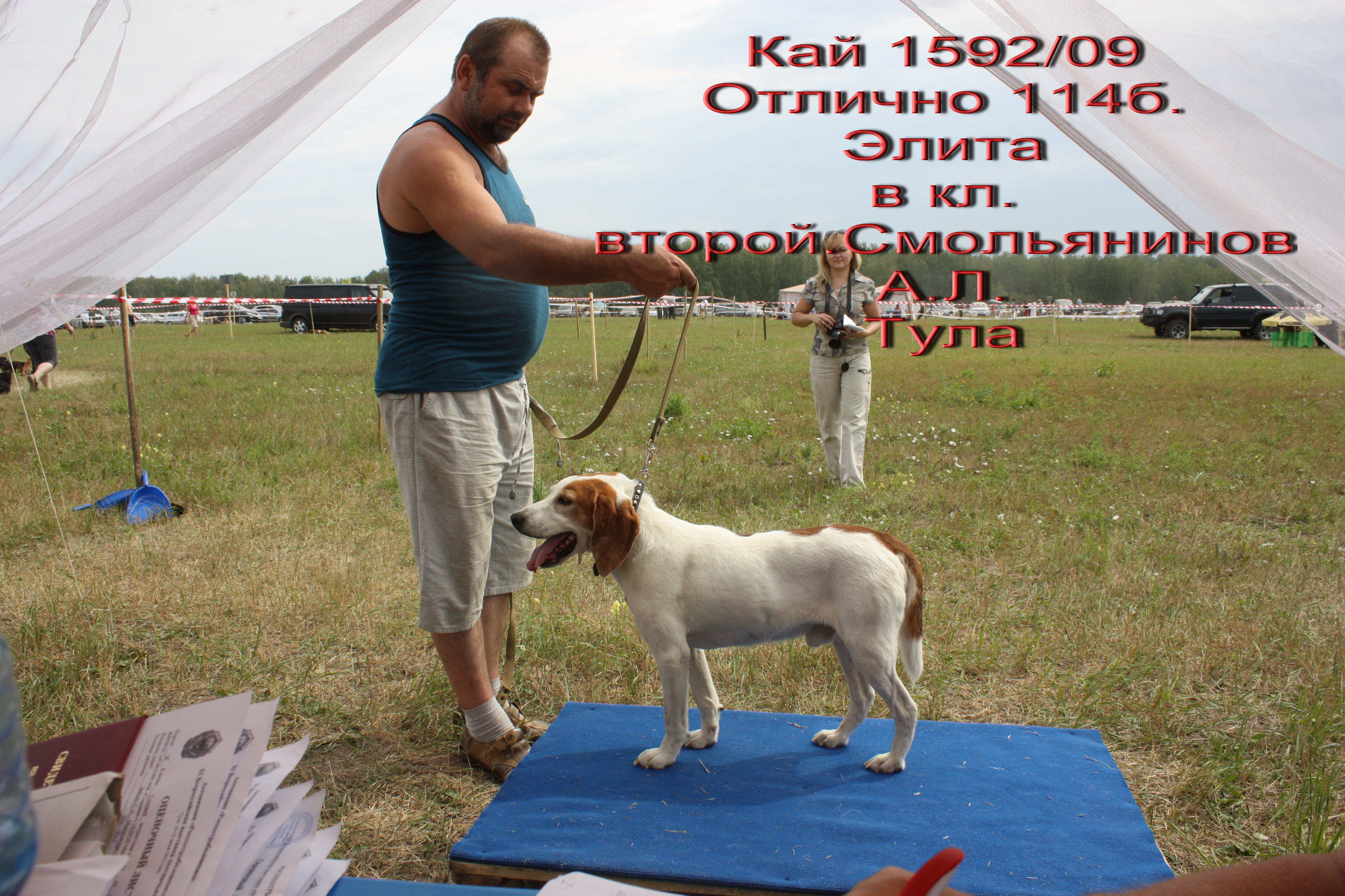 Еще через пять лет, на 10-ой Всероссийской выставке в г. Твери было выставлено 39 эстонских гончих. Экспертизу ринга проводил эксперт I категории – Киселев В.А. Чемпионами опять же стали Тимотэй Багдасарова и Авеста Петунина, но в обоих случаях им по одному очку проиграли молодые гончие владельца Смолянинова А.Л. из Тулы – ч. Мастер-II св. 1443/03 от ч.Бояна св.1389/01 Киселева В.А. и ч.Найды св.1407/оч. Неробова Е.А., и ч.Свирель св.1339/01 от Мастера св.1374/99 Смолянинова А.Л. и Леди св. 087-94/61 Хромченкова А.П. Элитных собак было уже шесть, а лучшей э/г в экстерьерном ринге был ч. Дунай св.1474/05 от ч.Бояна св.1389/01 Киселева В.А. и Найды св.1388/01 Мельникова М.В. Владелец: Дудник А.И., г. Череповец.