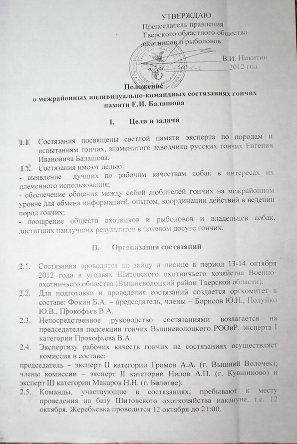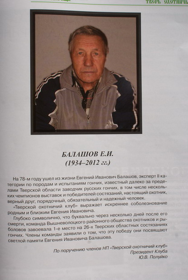 13-14 октября 2012г в г.В.Волочек состоятся состязания гончих собак, посвященные памяти эксперта- гончатника,посвятившему всю свою жизнь гончим- Балашову Евгению Ивановичу.