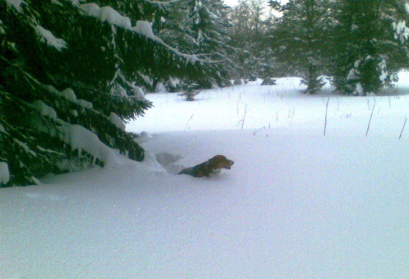 Гончая, привыкшая работать по снегу, проверяет видимые следы, сунув в них нос и, если он старый, т.е не пахнет, бросает его. В какой-то мере этот прием помогает гончей найти свежий след, но преследует зверя она обязательно по запаху. Часть гончих с выпадением снега работает лучше, чем по чернотропу, часть – хуже. Объяснить это можно тем, что запах на снегу сохраняется хуже, чем на влажной земле, одни гончие приспосабливаются к новым условиям, другие – нет.