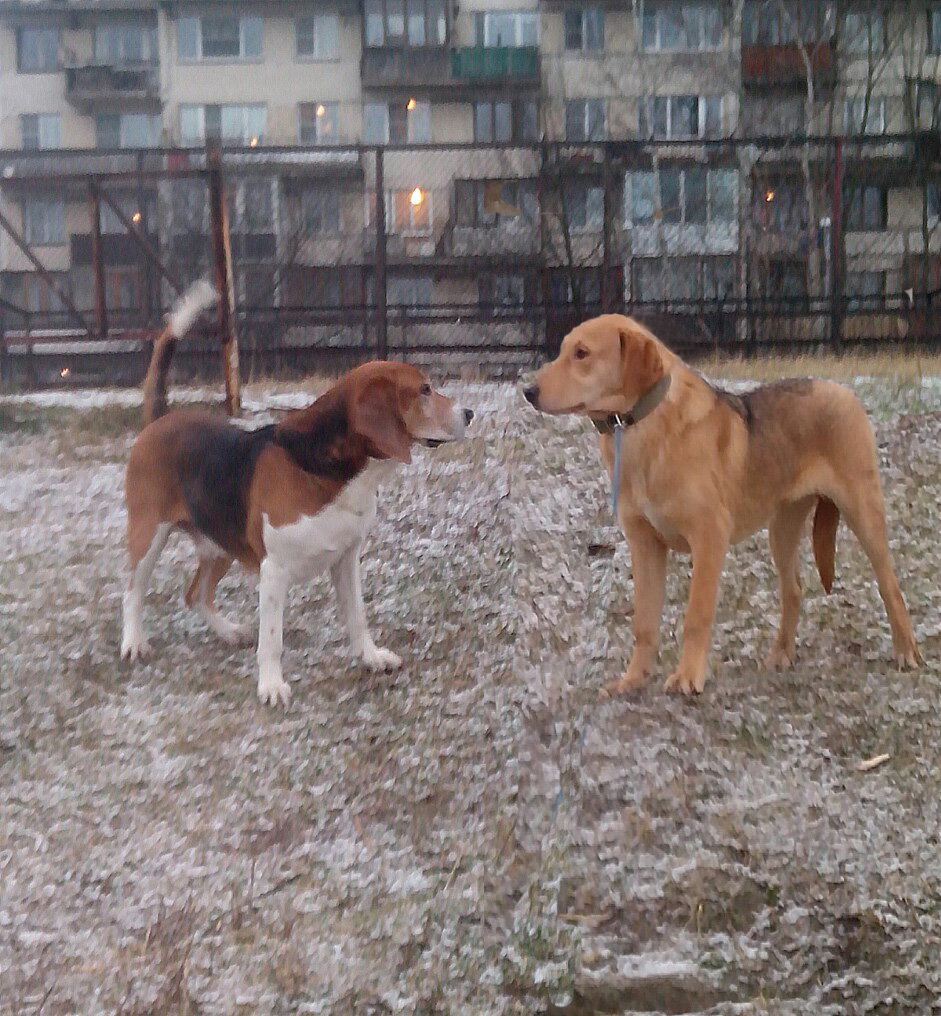 В лифт заносил на руках, сейчас ходит сам, но с опаской на эту адскую машину. Со старшим выжлецом "Никком" ладят, в лесу бегает за ним хвостиком, во дворе тоже.