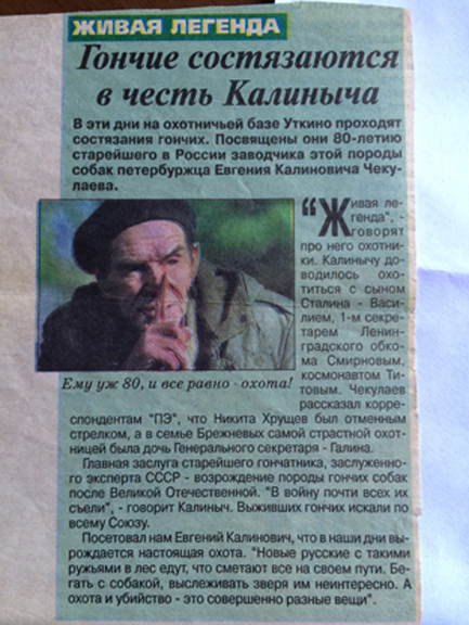 Чекулаева знали гончатники по всей стране. Бывало, я, чтобы узнать, где Калиныч, заходил в магазин радиотоваров на Большом проспекте Петроградской стороны Ленинграда, где кассиром работала его жена, и наводил у нее справки. Кстати, она тоже была любительница собак, но держала только декоративных, сейчас уже не помню, какой породы, то ли пекинесов, то ли болонок... Бывая до последних дней в «собачнике», Женя неизменно пользовался любовью и уважением всех. Гончатники прозвали его Дедом, хотя он и не выглядел старым. Я рад, что он одобрил и благословил мою статью «О рабочей памяти гончей», которую я ему прочитал за несколько дней до его кончины. Женя сказал при этом: «Статья правильная, но... кто же этого не знает!» Он знал о гончих все или почти все.